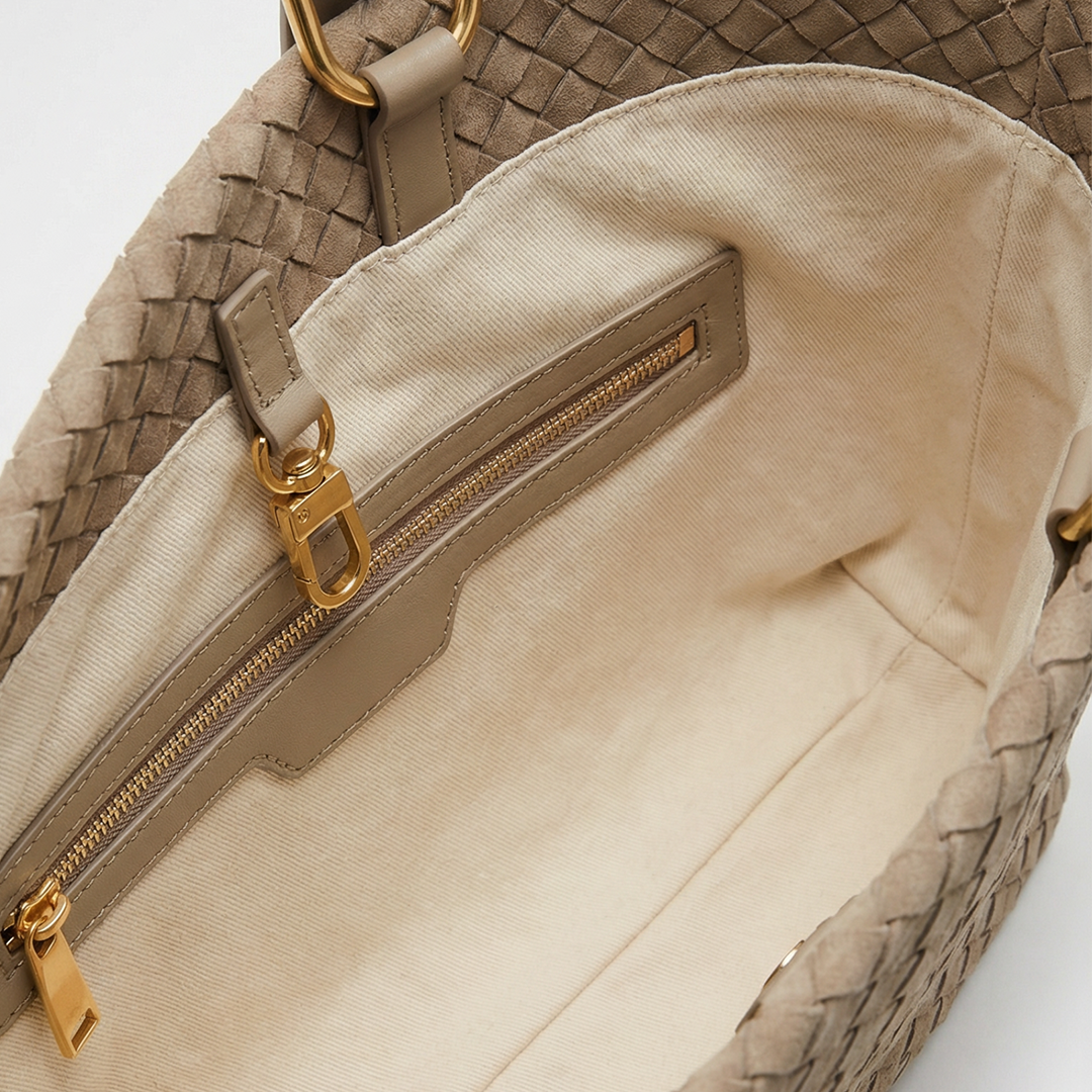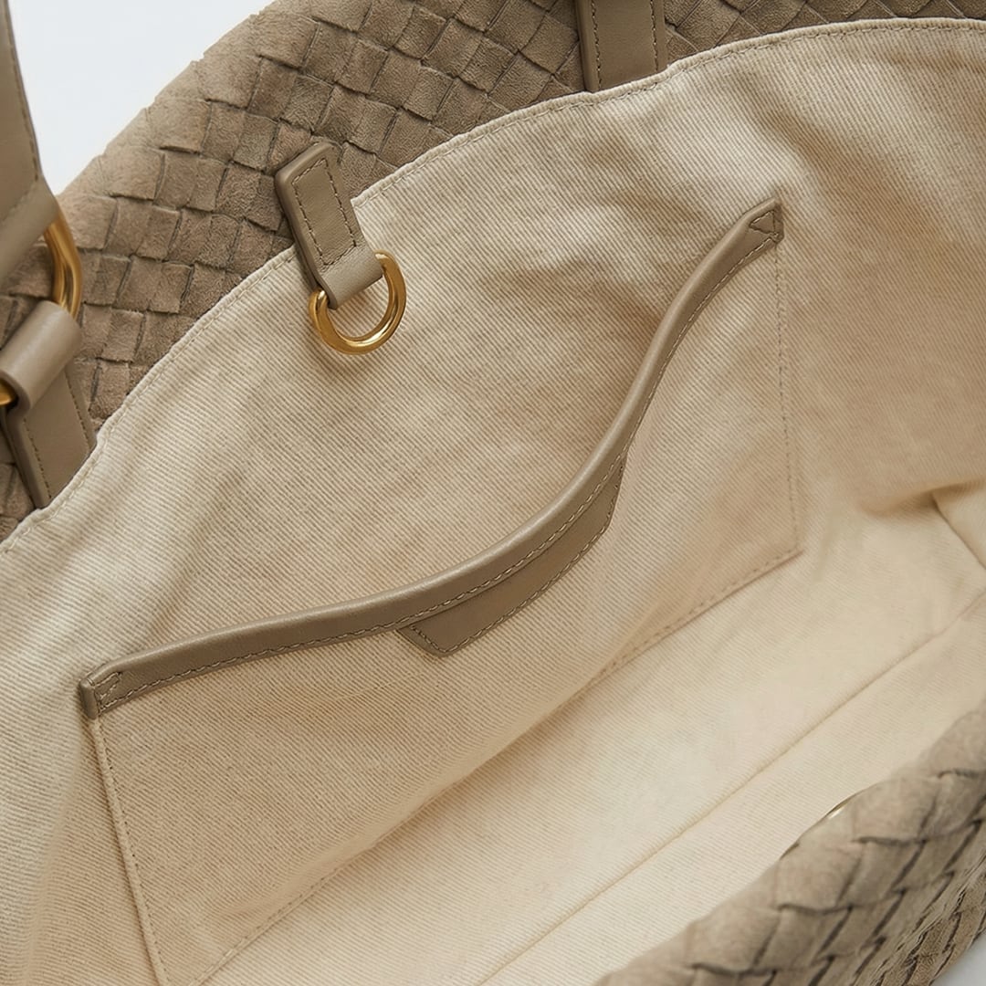 ボディには、きめ細やかで滑らかな手触りのスエードレザーを使用。マットな質感が編み込みの立体感を引き立て、温かみのある表情を見せます。ハンドルとショルダーストラップにはスムースレザーを用いることで、デザインにアクセントを加えています。