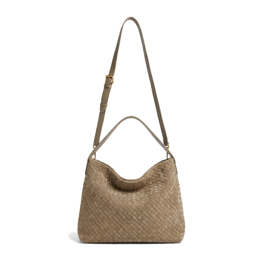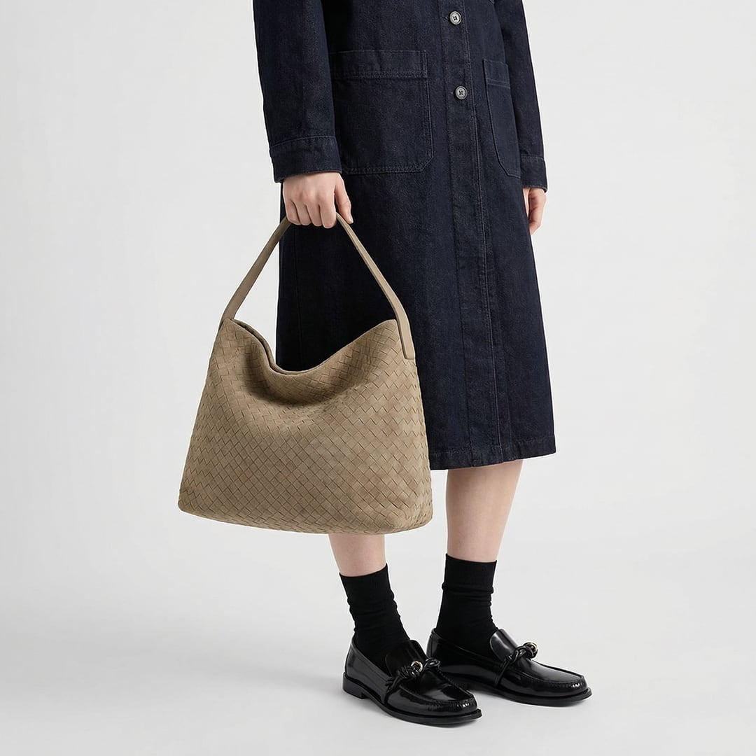 "Promesse"(プロメッセ)は、フランス語で「約束」を意味します。あなたの日常に静かに寄り添い、思考のリズムを乱さない——そんな約束を込めたホーボーバッグ。職人技が光る、スエードレザーの編み込み(イントレチャート)が全面に施された贅沢な一品です。肩にかけた時に自然に生まれるドレープが美しく、リラックスした中にも洗練されたムードを演出します。あえて芯を入れない柔らかな作りで、持つ人の身体に優しくフィットします。