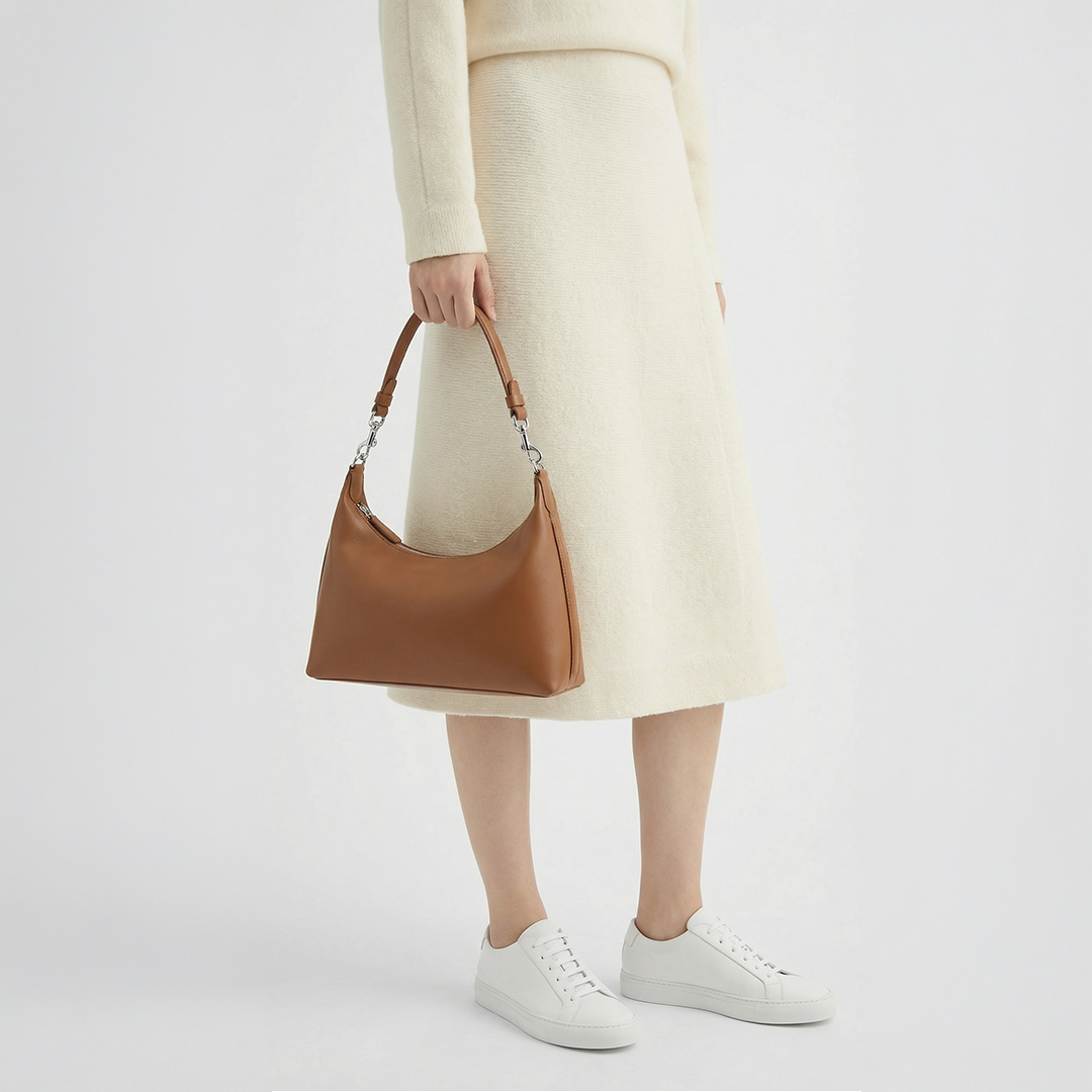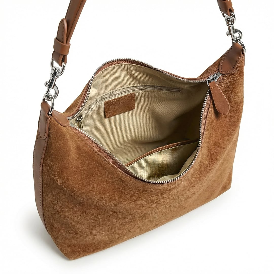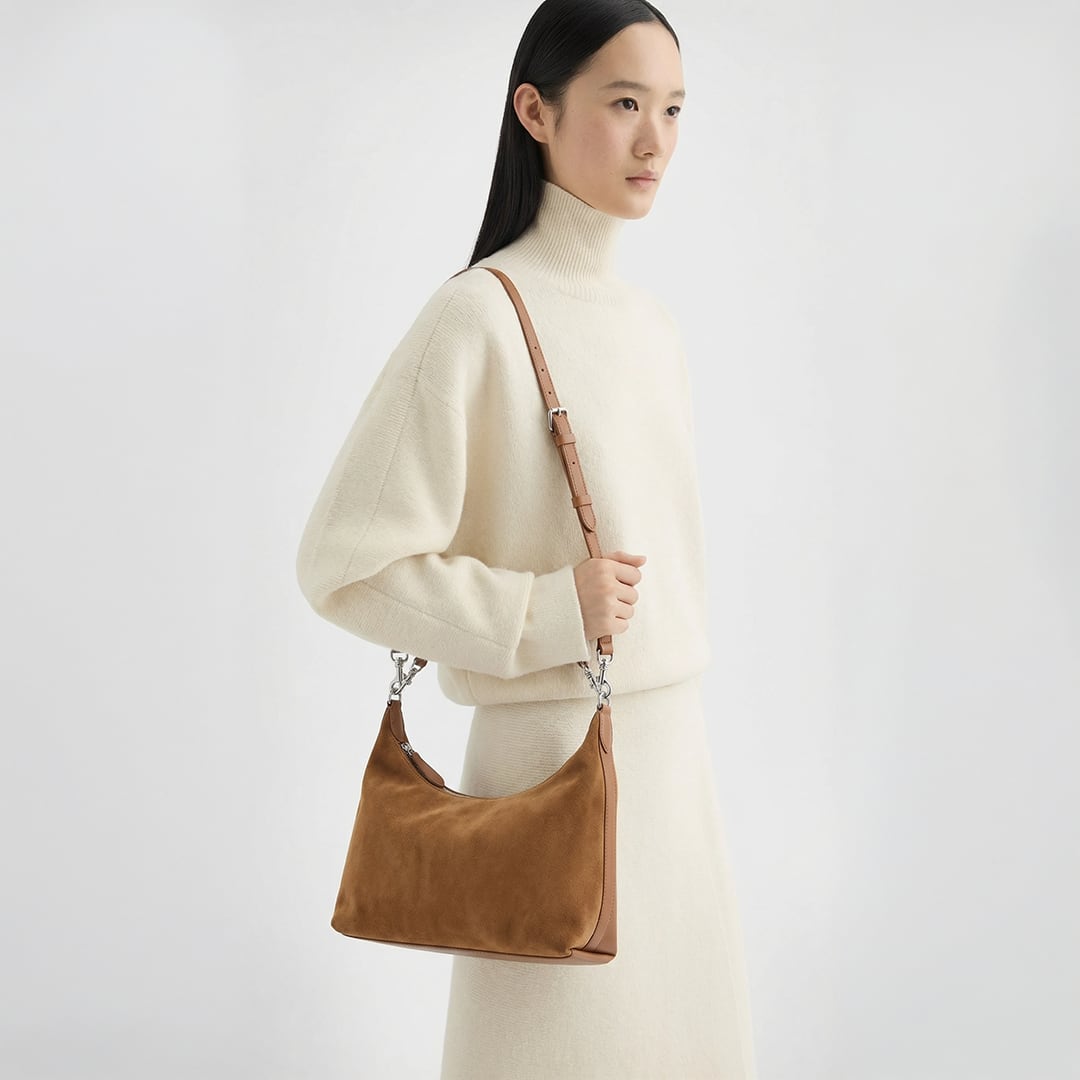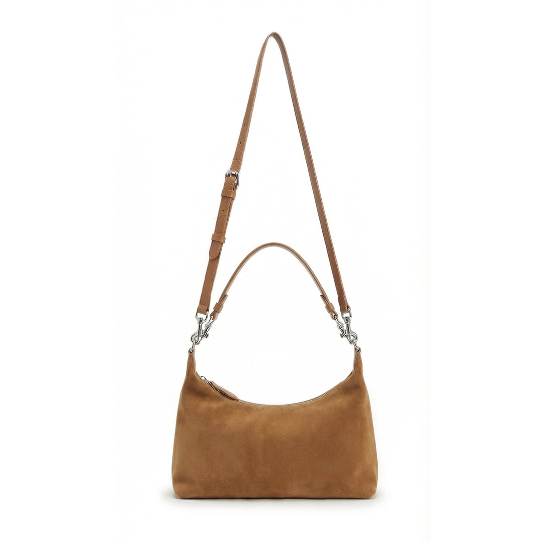 その名"Reflet"(ルフレ)は、フランス語で「反射」「映し出すもの」を意味します。片面にはスエードの柔らかな起毛を、もう片面には艶やかなスムースレザーを配した、二つの表情を持つショルダーバッグ。まるで光と影が互いを映し合うように、異なる質感が一つのフォルムの中で静かに響き合います。洗練された三日月(クレセント)フォルムはコンパクトながらも存在感があり、持つ角度や光の加減によって、そのたびに新しい表情を見せてくれます。