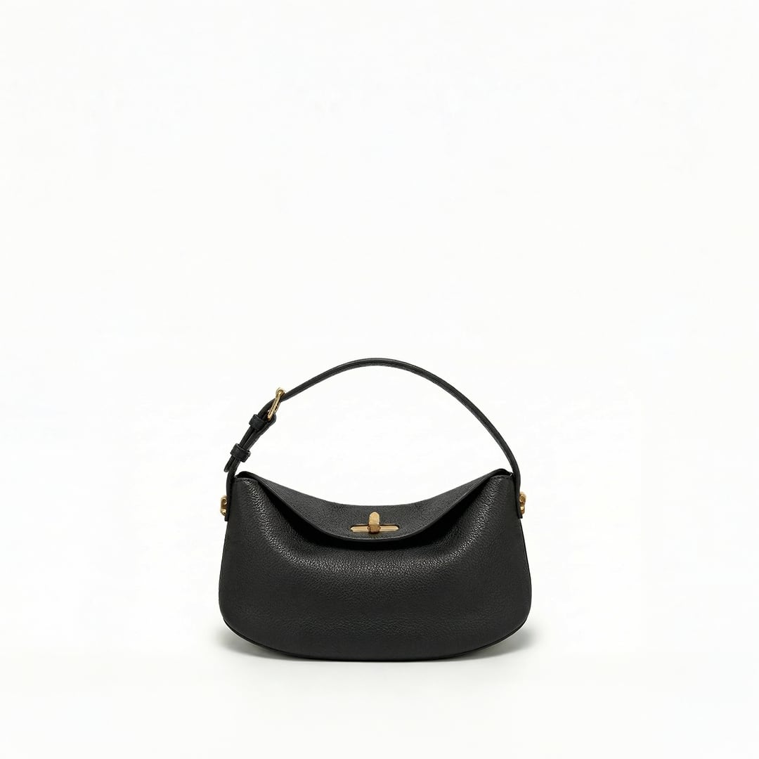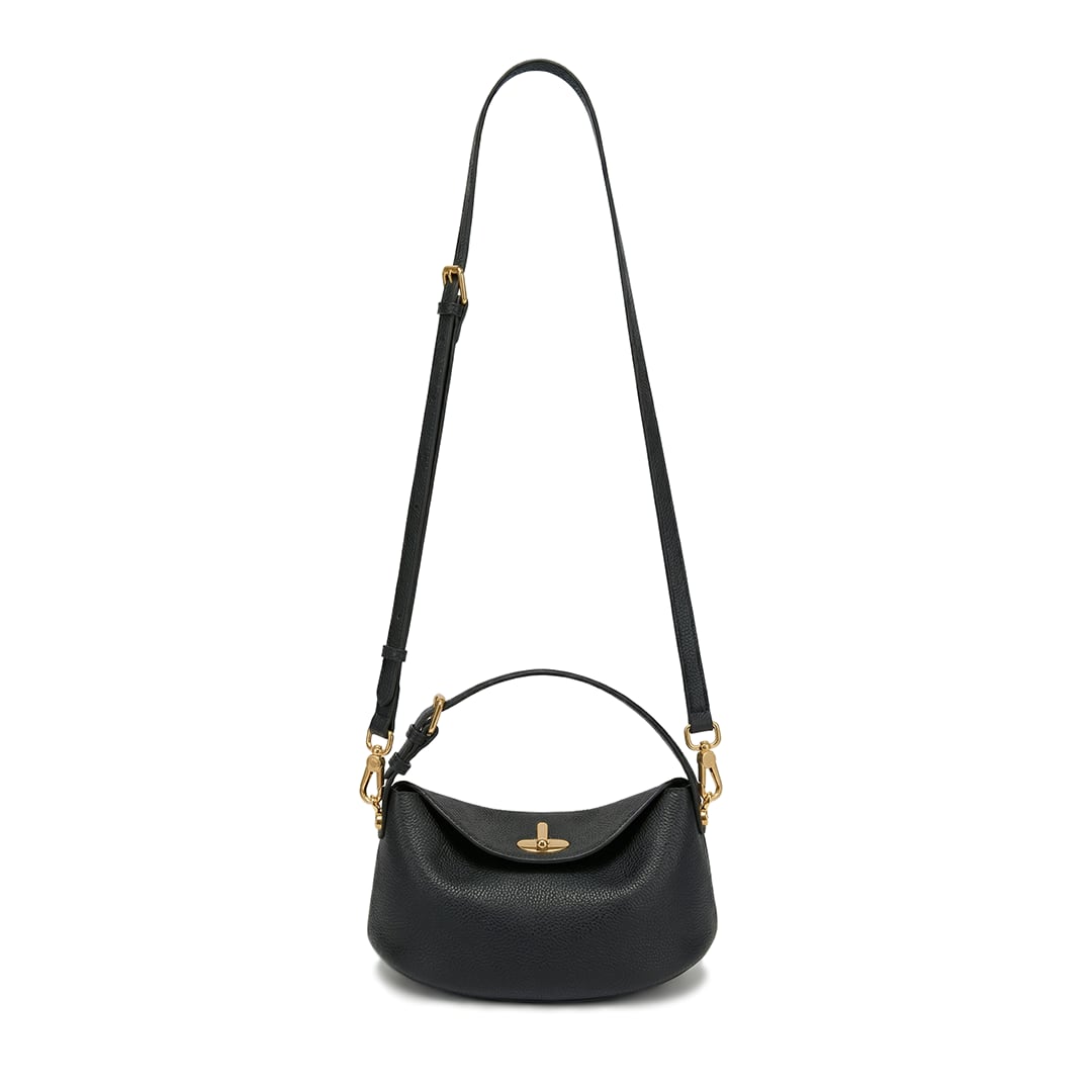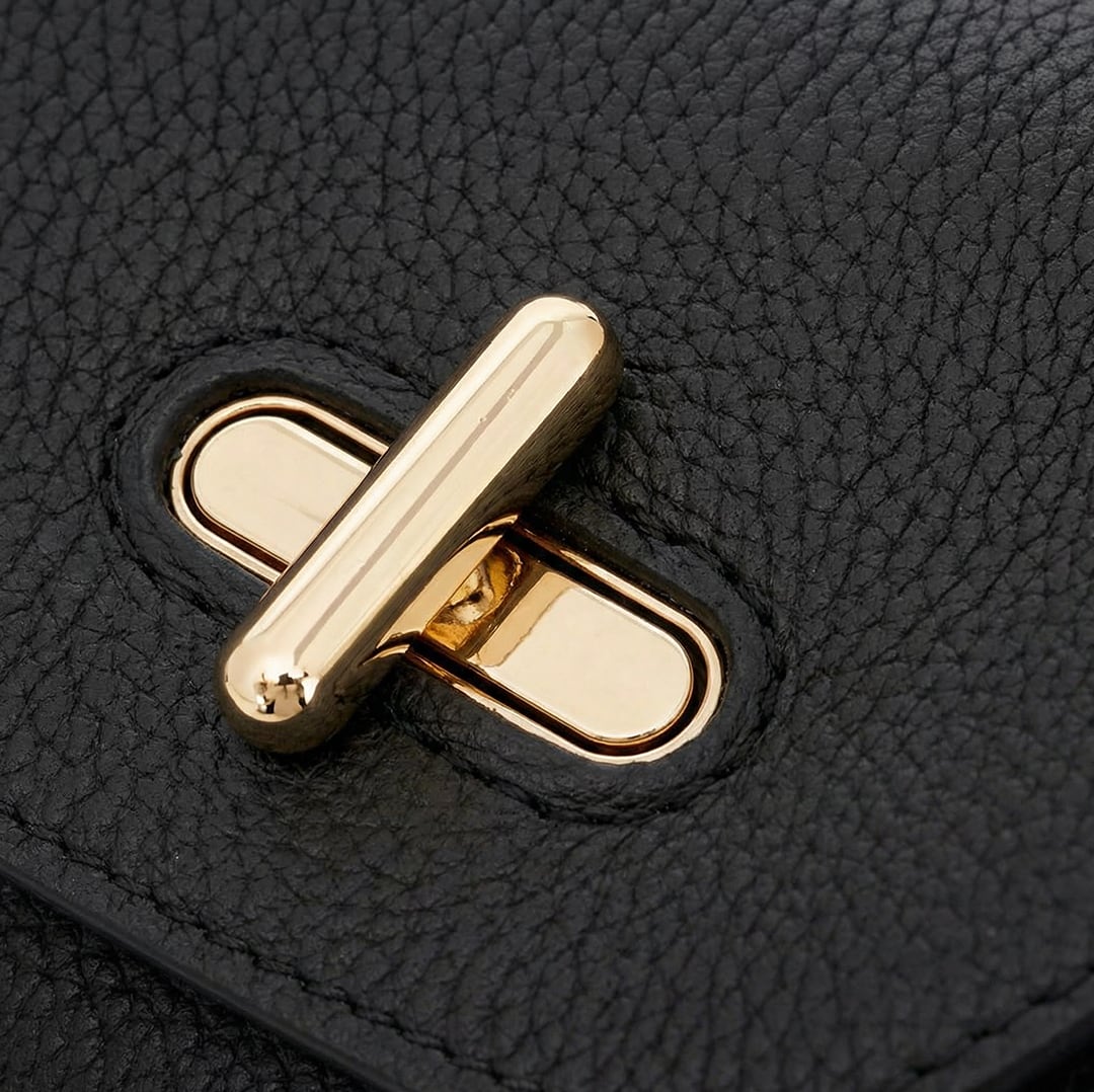 豊かなシボが美しい、上質なグレインレザーを贅沢に使用。しなやかで手に馴染む質感でありながら、傷が目立ちにくいのが特徴です。フラップで輝くターンロックと、ストラップを繋ぐ金具はすべてゴールドトーンで統一。深みのあるブラックレザーとのコントラストが、品格のある佇まいを演出します。