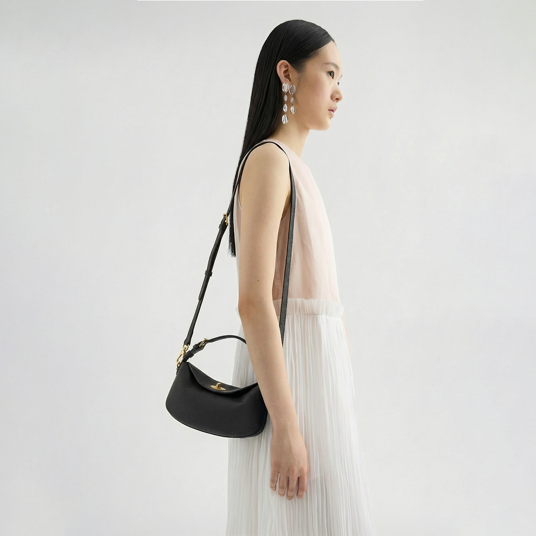 柔らかな三日月フォルムのフラップに、クラシカルなターンロックが静かに輝くショルダーバッグ。その名はフランス語で「宝石箱」を意味する“Écrin”(エクラン)。大切なものをそっとしまい、鍵をかける。そんな愛おしい所作を、日常にもたらしてくれます。付属のストラップを付け替えれば、ハンドバッグとしても、クロスボディとしても使える2WAY仕様。シーンに合わせて、あなただけの表情を見つけられます。