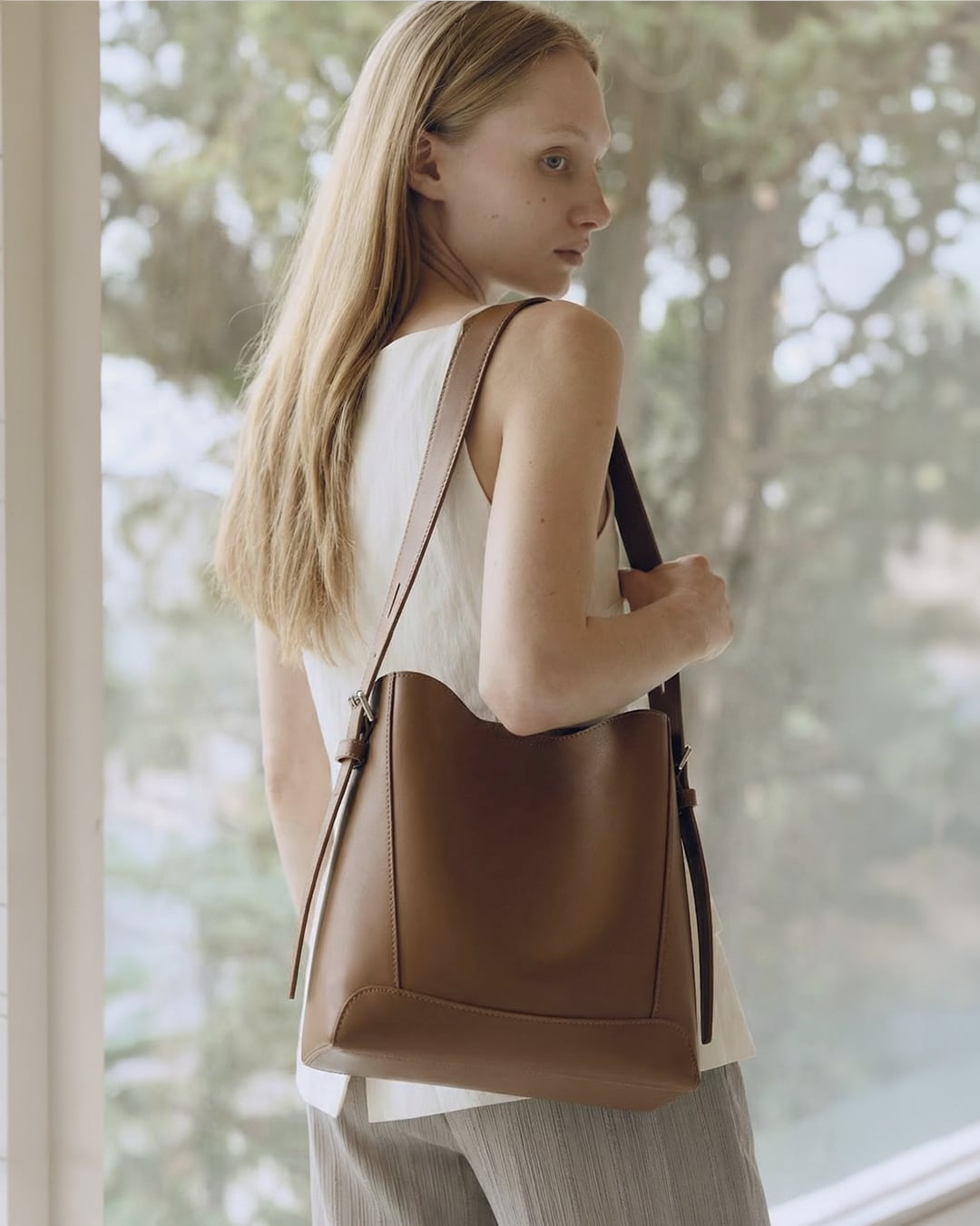 その名"Calme"(カルム)は、フランス語で「静けさ」を意味します。開口部に描かれたゆるやかなカーブが、このバッグの静かな個性。直線的なボディと柔らかな曲線が交わるフォルムは、ミニマルでありながらどこか温かみを感じさせます。サイドに添えられたストラップの余韻が、装いにさりげない動きを加えます。