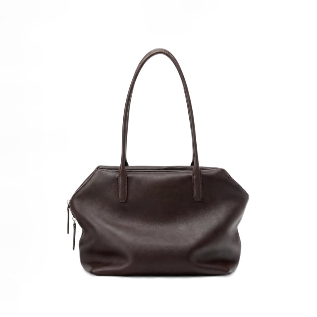 手持ちでも肩掛けでも美しく収まるハンドルの長さ。荷物の量やその日の気分に合わせて、フォルムが自然に変化するのもこのバッグの魅力です。ミニマルな装いにも、レイヤードスタイルにも、力を入れずに馴染みます。